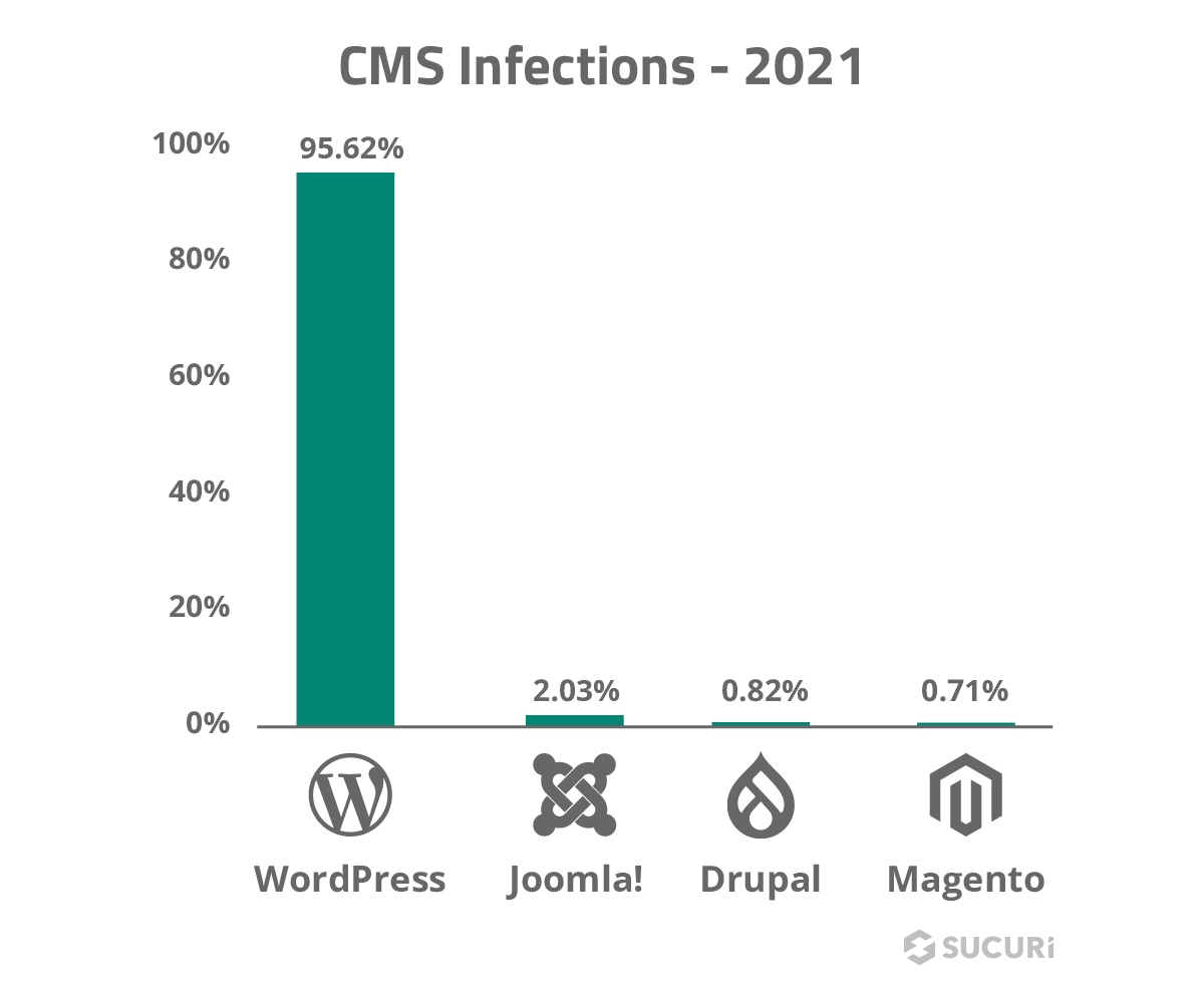 Tal como cuenta SUCURI en el año 2021 los ataques se produjeron en diferentes CMS, pero el que se lleva la palma de oro es WordPress, siendo así que hay un gran equipo de desarrollo detrás realizando e investigando este tipo de tareas y sucesos.